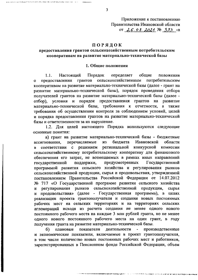 Постановление Правительства Ивановской области от 26.08.2021 N 393-п "Об утверждении Порядка предоставления грантов сельскохозяйственным потребительским кооперативам на развитие материально-технической базы"