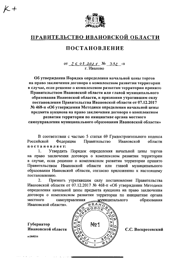 Постановление Правительства Ивановской области от 26.08.2021 N 392-п "Об утверждении Порядка определения начальной цены торгов на право заключения договора о комплексном развитии территории в случае, если решение о комплексном развитии территории принято Правительством Ивановской области или главой муниципального образования Ивановской области, и признании утратившим силу постановления Правительства Ивановской области от 07.12.2017 N 468-п "Об утверждении Методики определения начальной цены предмета аукциона на право заключения договора о комплексном развитии территории по инициативе органа местного самоуправления муниципального образования Ивановской области"