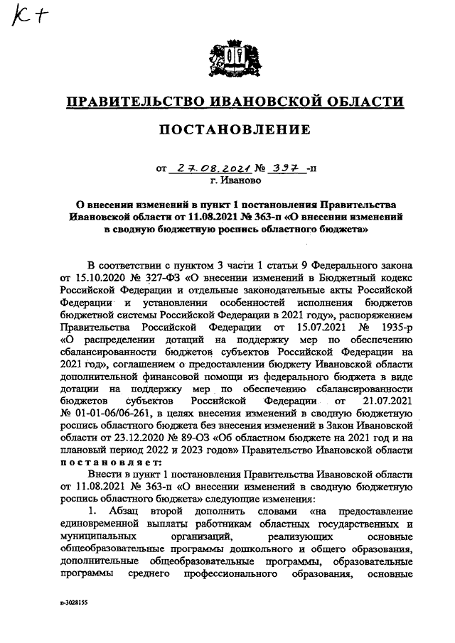 Постановление Правительства Ивановской области от 27.08.2021 N 397-п "О внесении изменений в пункт 1 постановления Правительства Ивановской области от 11.08.2021 N 363-п "О внесении изменений в сводную бюджетную роспись областного бюджета"