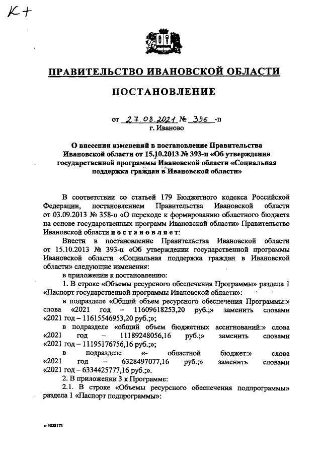 Постановление Правительства Ивановской области от 27.08.2021 N 396-п "О внесении изменений в постановление Правительства Ивановской области от 15.10.2013 N 393-п "Об утверждении государственной программы Ивановской области "Социальная поддержка граждан в Ивановской области"