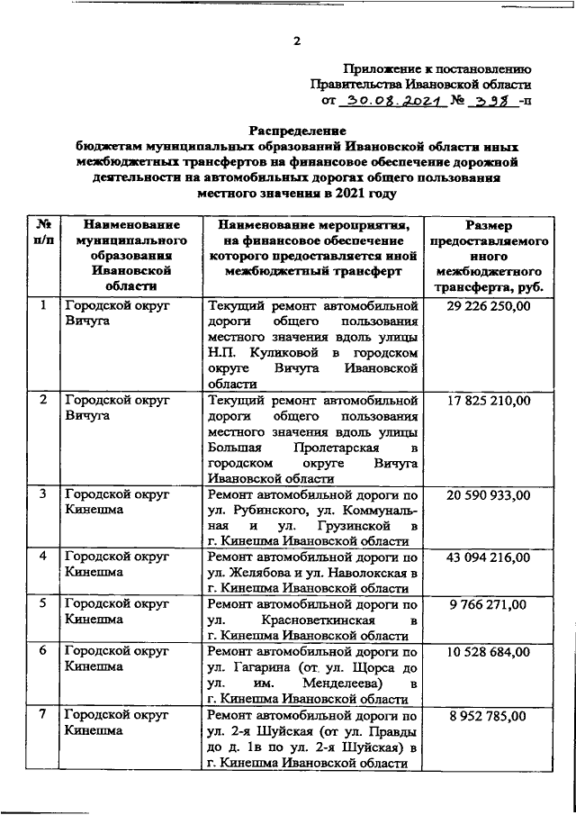 Постановление Правительства Ивановской области от 30.08.2021 N 398-п "О внесении изменений в постановление Правительства Ивановской области от 13.05.2021 N 228-п "О распределении бюджетам муниципальных образований Ивановской области иных межбюджетных трансфертов на финансовое обеспечение дорожной деятельности на автомобильных дорогах общего пользования местного значения в 2021 году"