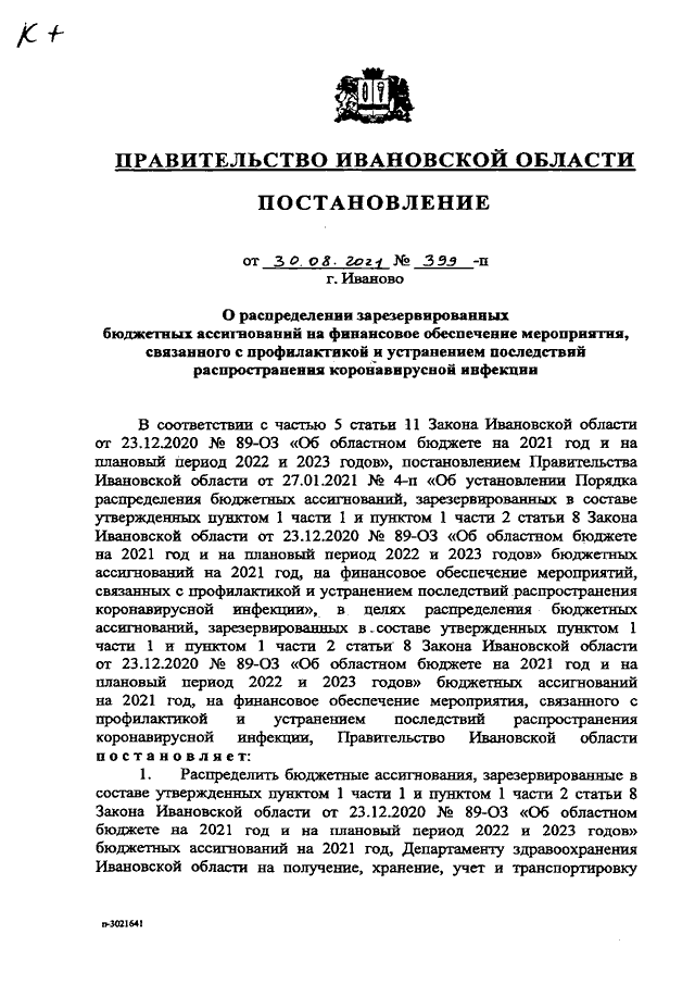 Постановление Правительства Ивановской области от 30.08.2021 N 399-п "О распределении зарезервированных бюджетных ассигнований на финансовое обеспечение мероприятия, связанного с профилактикой и устранением последствий распространения коронавирусной инфекции"