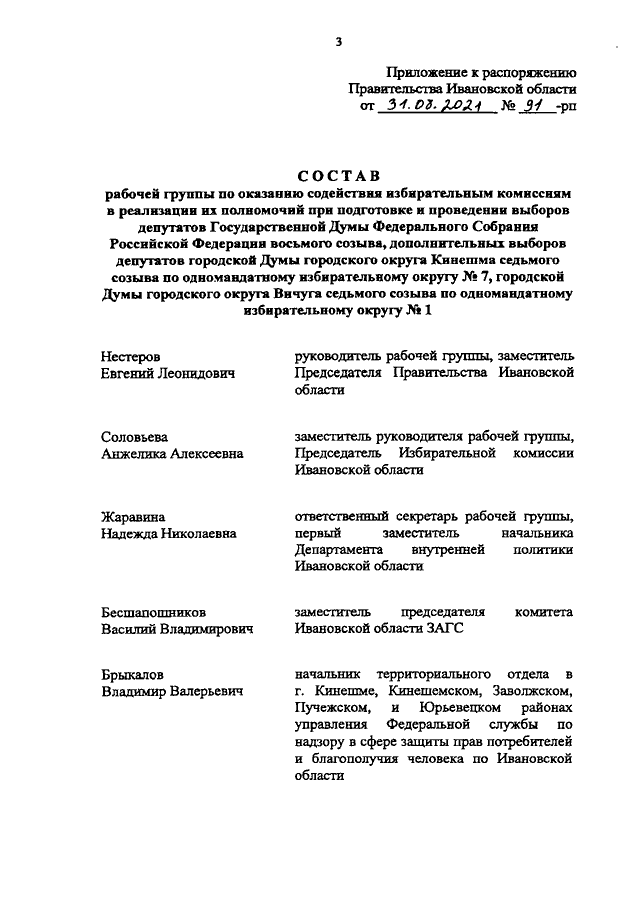 Распоряжение Правительства Ивановской области от 31.08.2021 N 91-рп "О создании рабочей группы по оказанию содействия избирательным комиссиям в реализации их полномочий при подготовке и проведении выборов депутатов Государственной Думы Федерального Собрания Российской Федерации восьмого созыва, дополнительных выборов депутатов городской Думы городского округа Кинешма седьмого созыва по одномандатному избирательному округу N 7, городской Думы городского округа Вичуга седьмого созыва по одномандатному избирательному округу N 1"