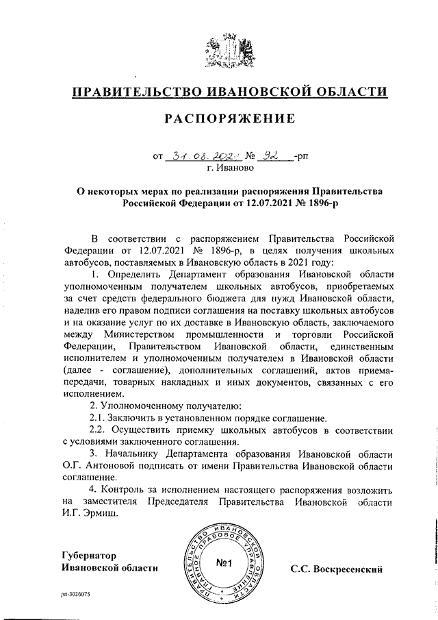 Распоряжение Правительства Ивановской области от 31.08.2021 N 92-рп "О некоторых мерах по реализации распоряжения Правительства Российской Федерации от 12.07.2021 N 1896-р"
