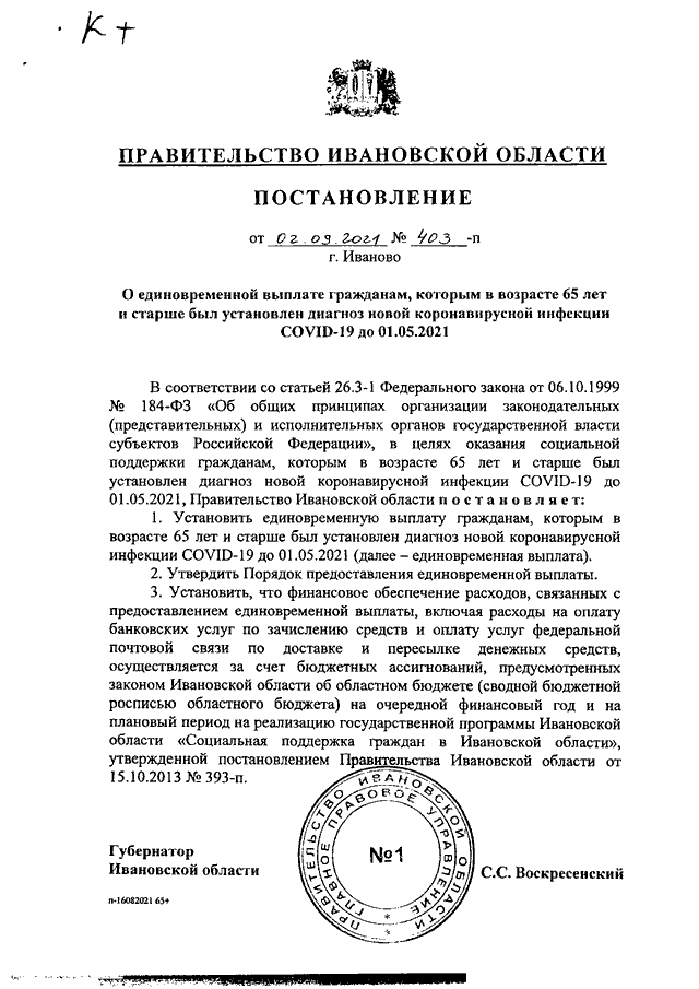 Постановление Правительства Ивановской области от 02.09.2021 N 403-п "О единовременной выплате гражданам, которым в возрасте 65 лет и старше был установлен диагноз новой коронавирусной инфекции COVID-19 до 01.05.2021" (вместе с "Порядком предоставления единовременной выплаты гражданам, которым в возрасте 65 лет и старше был установлен диагноз новой коронавирусной инфекции COVID-19 до 01.05.2021")