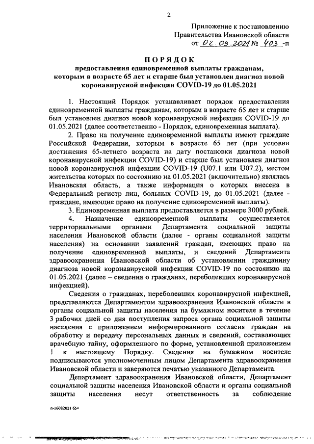 Постановление Правительства Ивановской области от 02.09.2021 N 403-п "О единовременной выплате гражданам, которым в возрасте 65 лет и старше был установлен диагноз новой коронавирусной инфекции COVID-19 до 01.05.2021" (вместе с "Порядком предоставления единовременной выплаты гражданам, которым в возрасте 65 лет и старше был установлен диагноз новой коронавирусной инфекции COVID-19 до 01.05.2021")