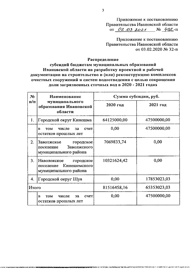 Постановление Правительства Ивановской области от 02.09.2021 N 402-п "О внесении изменения в постановление Правительства Ивановской области от 03.02.2020 N 32-п "О распределении субсидий бюджетам муниципальных образований Ивановской области на разработку проектной и рабочей документации на строительство и (или) реконструкцию комплексов очистных сооружений и систем водоотведения с целью сокращения доли загрязненных сточных вод в 2020 - 2021 годах и признании утратившим силу постановления Правительства Ивановской области от 22.08.2019 N 326-п "О распределении субсидий бюджетам муниципальных образований Ивановской области на разработку проектной и рабочей документации на строительство и (или) реконструкцию комплексов очистных сооружений и систем водоотведения с целью сокращения доли загрязненных сточных вод в 2019 году"