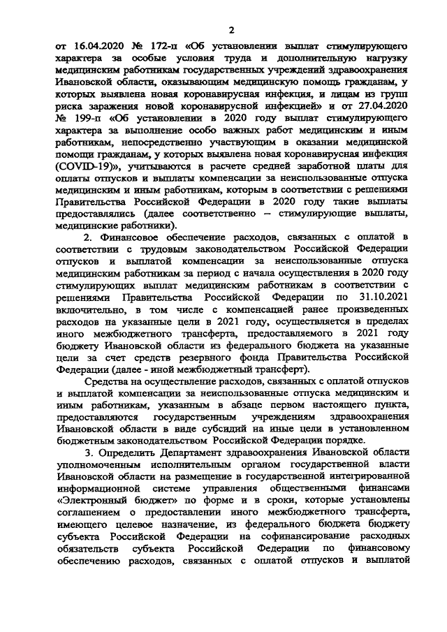 Постановление Правительства Ивановской области от 03.09.2021 N 410-п "Об обеспечении расходов, связанных с оплатой отпусков и выплатой компенсации за неиспользованные отпуска медицинским и иным работникам, которым в соответствии с решениями Правительства Российской Федерации в 2020 году предоставлялись выплаты стимулирующего характера за выполнение особо важных работ, особые условия труда и дополнительную нагрузку, в том числе на компенсацию ранее произведенных субъектами Российской Федерации расходов на указанные цели"