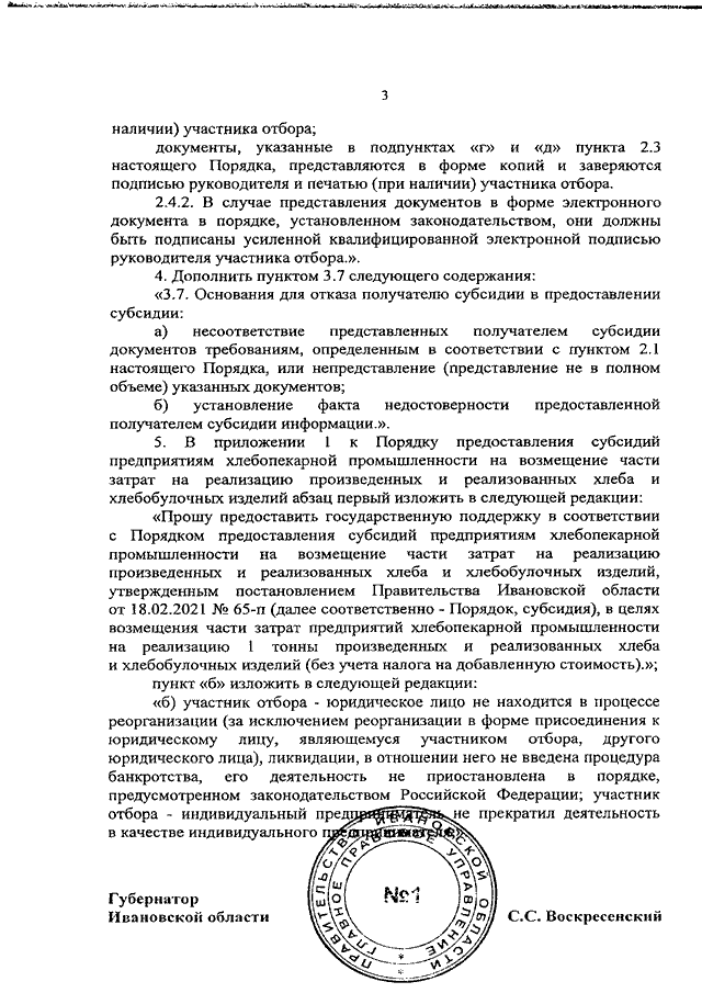 Постановление Правительства Ивановской области от 10.09.2021 N 413-п "О внесении изменений в постановление Правительства Ивановской области от 18.02.2021 N 65-п "Об утверждении Порядка предоставления субсидий предприятиям хлебопекарной промышленности на возмещение части затрат на реализацию произведенных и реализованных хлеба и хлебобулочных изделий"