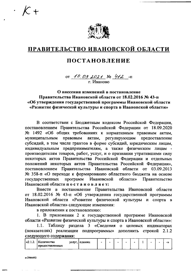 Постановление Правительства Ивановской области от 10.09.2021 N 412-п "О внесении изменений в постановление Правительства Ивановской области от 18.02.2016 N 43-п "Об утверждении государственной программы Ивановской области "Развитие физической культуры и спорта в Ивановской области" (вместе с "Порядком предоставления грантов в форме субсидий на оказание государственной поддержки спортивных организаций, осуществляющих подготовку спортивного резерва для спортивных сборных команд, в том числе спортивных сборных команд Российской Федерации")