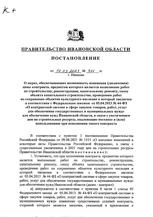 Постановление Правительства Ивановской области от 10.09.2021 N 411-п "О мерах, обеспечивающих возможность изменения (увеличения) цены контракта, предметом которого является выполнение работ по строительству, реконструкции, капитальному ремонту, сносу объекта капитального строительства, проведению работ по сохранению объектов культурного наследия и который заключен в соответствии с Федеральным законом от 05.04.2013 N 44-ФЗ "О контрактной системе в сфере закупок товаров, работ, услуг для обеспечения государственных и муниципальных нужд" для обеспечения нужд Ивановской области, в связи с увеличением цен на строительные ресурсы, подлежащие поставке и (или) использованию при исполнении такого контракта" (вместе с "Перечнем заказчиков, являющихся стороной контракта, предметом которого является выполнение работ по строительству, реконструкции, капитальному ремонту, сносу объекта капитального строительства, проведению работ по сохранению объектов культурного наследия и который заключен в соответствии с Федеральным законом от 05.04.2013 N 44-ФЗ "О контрактной системе в сфере закупок товаров, работ, услуг для обеспечения государственных и муниципальных нужд" для обеспечения нужд Ивановской области")