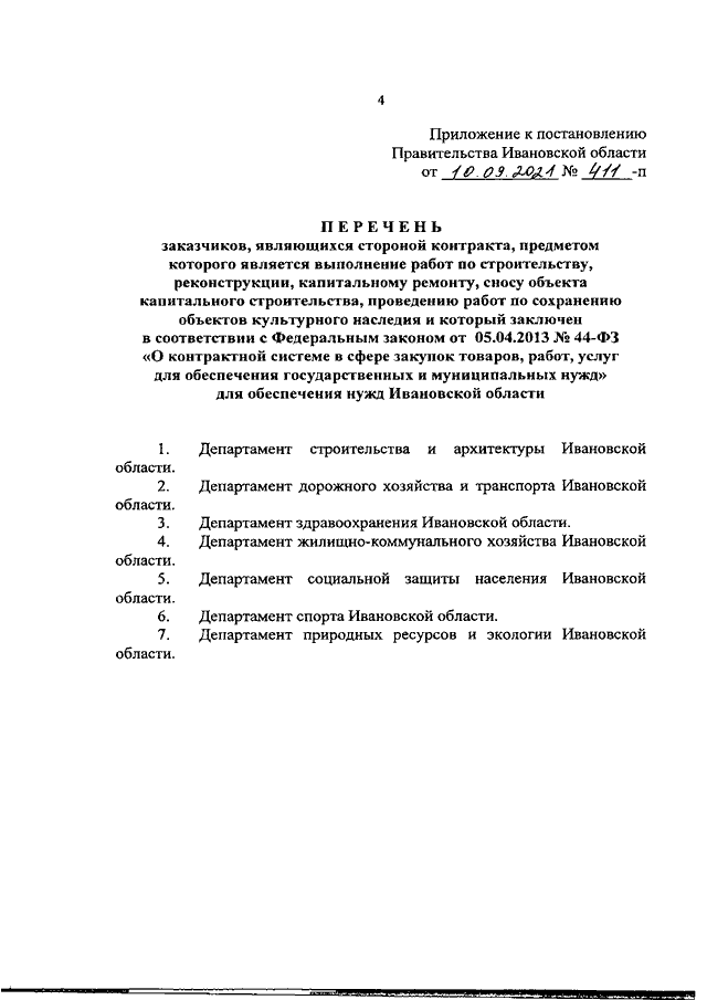 Постановление Правительства Ивановской области от 10.09.2021 N 411-п "О мерах, обеспечивающих возможность изменения (увеличения) цены контракта, предметом которого является выполнение работ по строительству, реконструкции, капитальному ремонту, сносу объекта капитального строительства, проведению работ по сохранению объектов культурного наследия и который заключен в соответствии с Федеральным законом от 05.04.2013 N 44-ФЗ "О контрактной системе в сфере закупок товаров, работ, услуг для обеспечения государственных и муниципальных нужд" для обеспечения нужд Ивановской области, в связи с увеличением цен на строительные ресурсы, подлежащие поставке и (или) использованию при исполнении такого контракта" (вместе с "Перечнем заказчиков, являющихся стороной контракта, предметом которого является выполнение работ по строительству, реконструкции, капитальному ремонту, сносу объекта капитального строительства, проведению работ по сохранению объектов культурного наследия и который заключен в соответствии с Федеральным законом от 05.04.2013 N 44-ФЗ "О контрактной системе в сфере закупок товаров, работ, услуг для обеспечения государственных и муниципальных нужд" для обеспечения нужд Ивановской области")