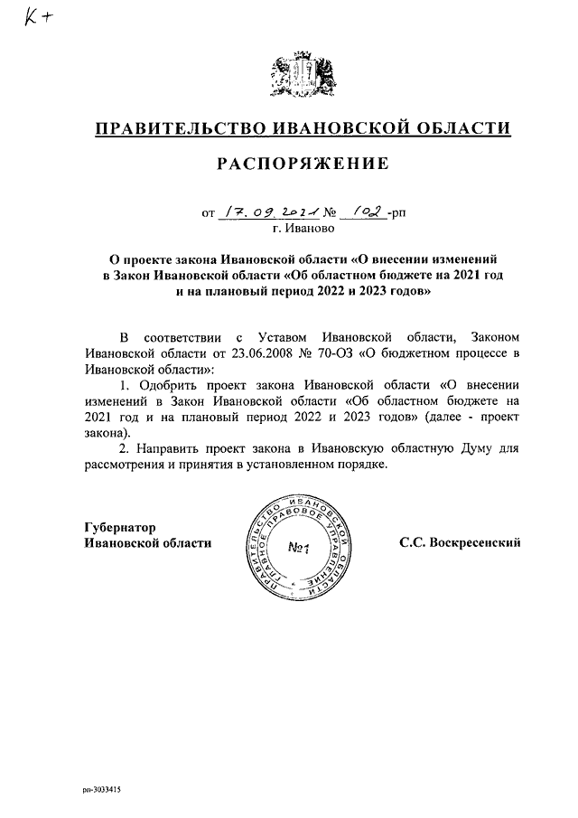 Распоряжение Правительства Ивановской области от 17.09.2021 N 102-рп "О проекте закона Ивановской области "О внесении изменений в Закон Ивановской области "Об областном бюджете на 2021 год и на плановый период 2022 и 2023 годов"
