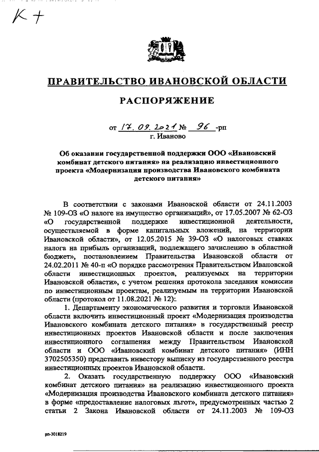 Распоряжение Правительства Ивановской области от 17.09.2021 N 96-рп "Об оказании государственной поддержки ООО "Ивановский комбинат детского питания" на реализацию инвестиционного проекта "Модернизация производства Ивановского комбината детского питания"