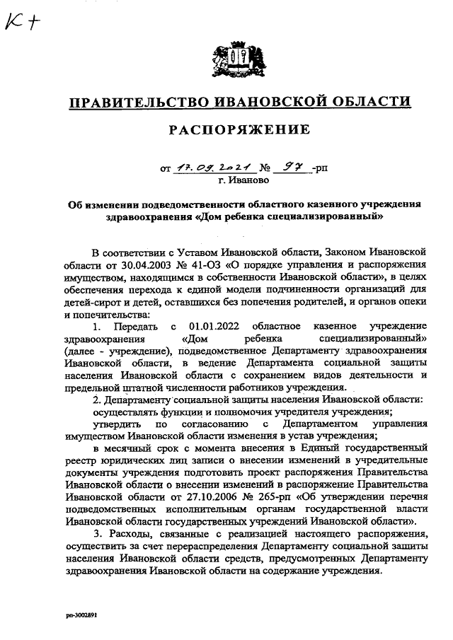 Распоряжение Правительства Ивановской области от 17.09.2021 N 97-рп "Об изменении подведомственности областного казенного учреждения здравоохранения "Дом ребенка специализированный"