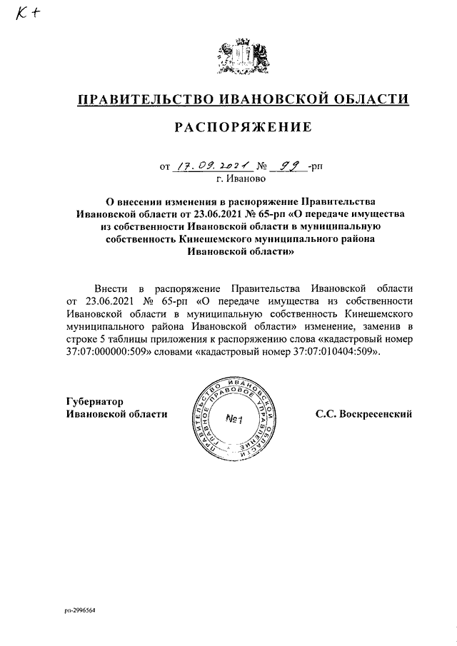 Распоряжение Правительства Ивановской области от 17.09.2021 N 99-рп "О внесении изменения в распоряжение Правительства Ивановской области от 23.06.2021 N 65-рп "О передаче имущества из собственности Ивановской области в муниципальную собственность Кинешемского муниципального района Ивановской области"