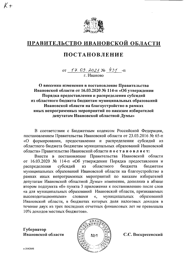 Постановление Правительства Ивановской области от 17.09.2021 N 431-п "О внесении изменения в постановление Правительства Ивановской области от 16.03.2020 N 114-п "Об утверждении Порядка предоставления и распределения субсидий из областного бюджета бюджетам муниципальных образований Ивановской области на благоустройство в рамках иных непрограммных мероприятий по наказам избирателей депутатам Ивановской областной Думы"