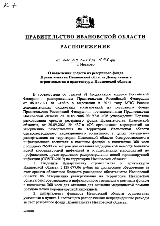 Распоряжение Правительства Ивановской области от 20.09.2021 N 103-рп "О выделении средств из резервного фонда Правительства Ивановской области Департаменту строительства и архитектуры Ивановской области"