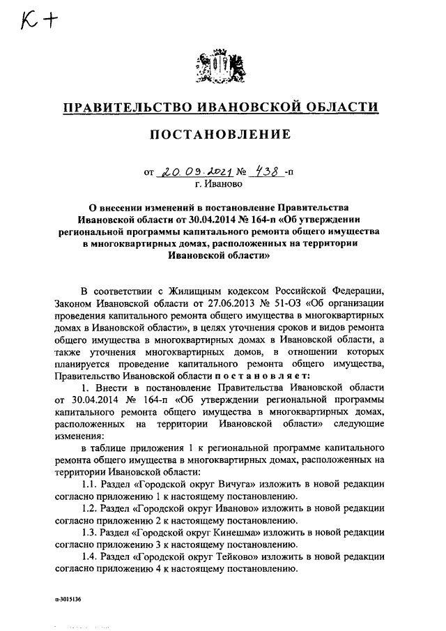 Постановление Правительства Ивановской области от 20.09.2021 N 438-п "О внесении изменений в постановление Правительства Ивановской области от 30.04.2014 N 164-п "Об утверждении региональной программы капитального ремонта общего имущества в многоквартирных домах, расположенных на территории Ивановской области"