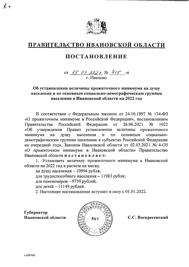 Постановление Правительства Ивановской области от 15.09.2021 N 415-п "Об установлении величины прожиточного минимума на душу населения и по основным социально-демографическим группам населения в Ивановской области на 2022 год"
