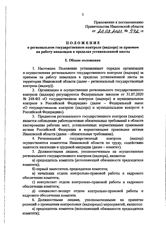 Постановление Правительства Ивановской области от 20.09.2021 N 442-п "Об утверждении Положения о региональном государственном контроле (надзоре) за приемом на работу инвалидов в пределах установленной квоты"