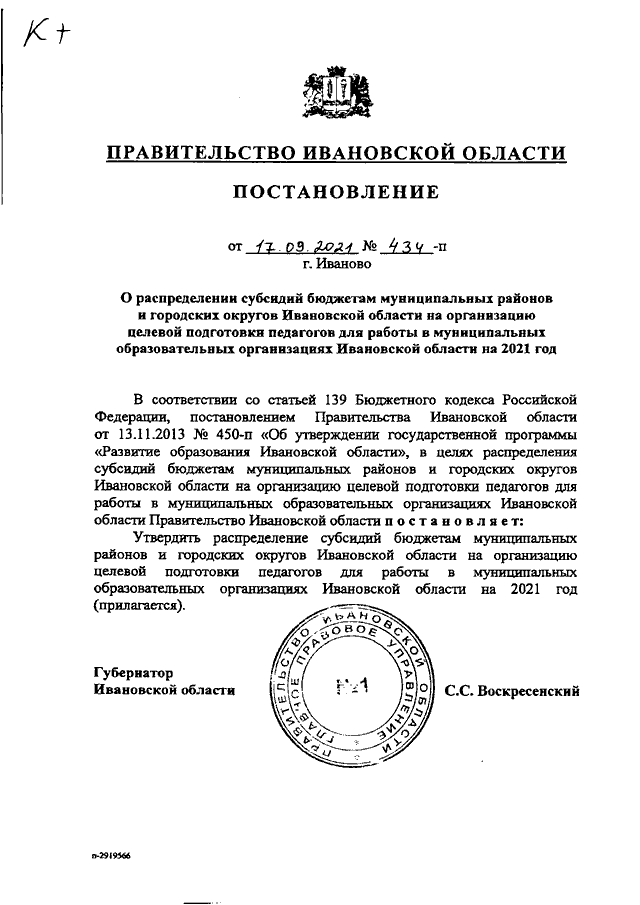 Постановление Правительства Ивановской области от 17.09.2021 N 434-п "О распределении субсидий бюджетам муниципальных районов и городских округов Ивановской области на организацию целевой подготовки педагогов для работы в муниципальных образовательных организациях Ивановской области на 2021 год"