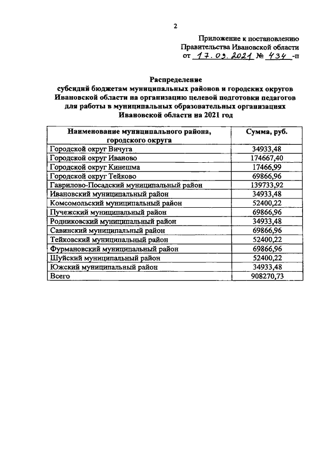 Постановление Правительства Ивановской области от 17.09.2021 N 434-п "О распределении субсидий бюджетам муниципальных районов и городских округов Ивановской области на организацию целевой подготовки педагогов для работы в муниципальных образовательных организациях Ивановской области на 2021 год"