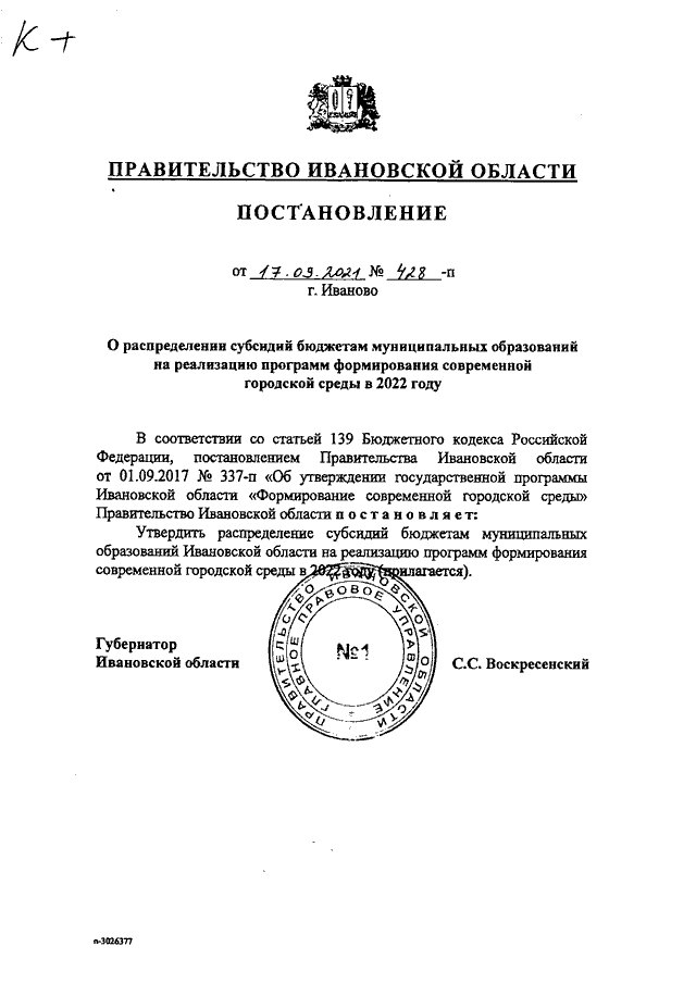 Постановление Правительства Ивановской области от 17.09.2021 N 428-п "О распределении субсидий бюджетам муниципальных образований на реализацию программ формирования современной городской среды в 2022 году"