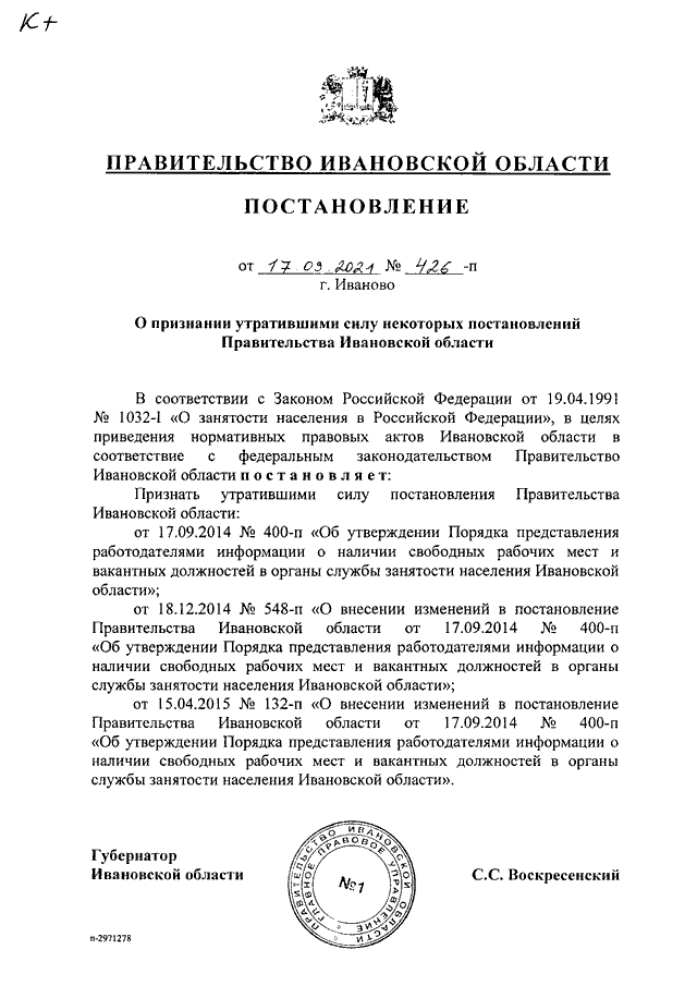 Постановление Правительства Ивановской области от 17.09.2021 N 426-п "О признании утратившими силу некоторых постановлений Правительства Ивановской области"