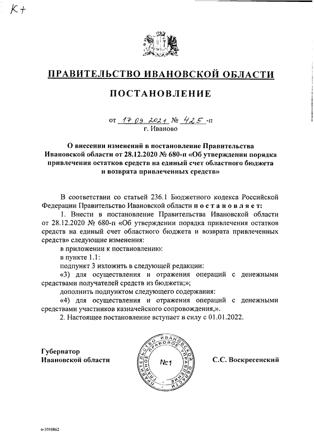 Постановление Правительства Ивановской области от 17.09.2021 N 425-п "О внесении изменений в постановление Правительства Ивановской области от 28.12.2020 N 680-п "Об утверждении порядка привлечения остатков средств на единый счет областного бюджета и возврата привлеченных средств"