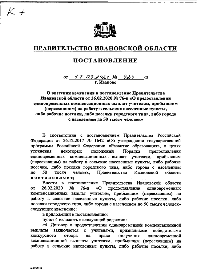 Постановление Правительства Ивановской области от 17.09.2021 N 424-п "О внесении изменения в постановление Правительства Ивановской области от 26.02.2020 N 76-п "О предоставлении единовременных компенсационных выплат учителям, прибывшим (переехавшим) на работу в сельские населенные пункты, либо рабочие поселки, либо поселки городского типа, либо города с населением до 50 тысяч человек"