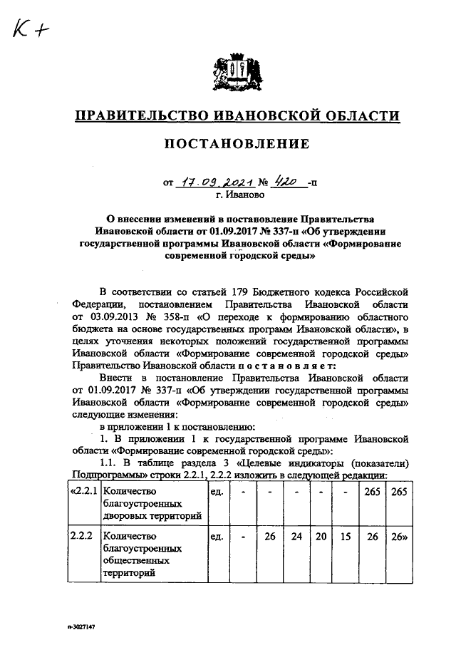 Постановление Правительства Ивановской области от 17.09.2021 N 420-п "О внесении изменений в постановление Правительства Ивановской области от 01.09.2017 N 337-п "Об утверждении государственной программы Ивановской области "Формирование современной городской среды"