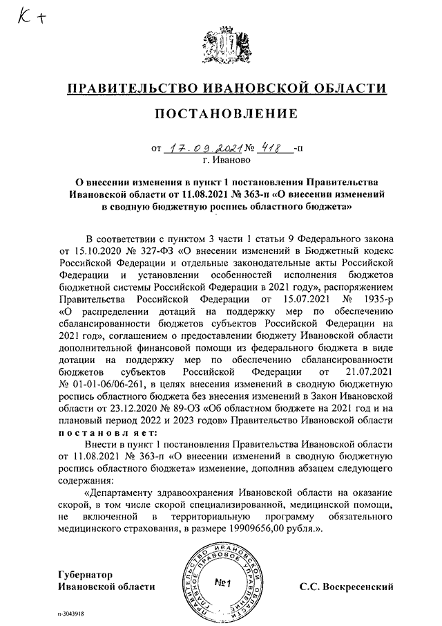 Постановление Правительства Ивановской области от 17.09.2021 N 418-п "О внесении изменения в пункт 1 постановления Правительства Ивановской области от 11.08.2021 N 363-п "О внесении изменений в сводную бюджетную роспись областного бюджета"