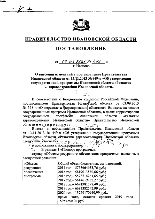 Постановление Правительства Ивановской области от 17.09.2021 N 416-п "О внесении изменений в постановление Правительства Ивановской области от 13.11.2013 N 449-п "Об утверждении государственной программы Ивановской области "Развитие здравоохранения Ивановской области"