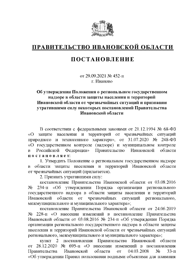 Постановление Правительства Ивановской области от 29.09.2021 N 452-п "Об утверждении Положения о региональном государственном надзоре в области защиты населения и территорий Ивановской области от чрезвычайных ситуаций и признании утратившими силу некоторых постановлений Правительства Ивановской области"