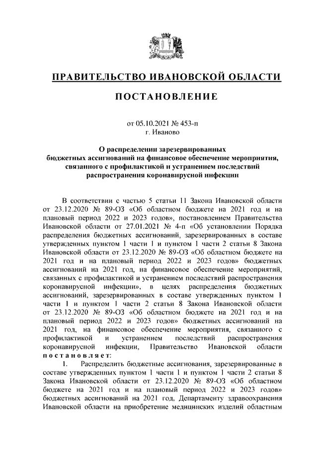 Постановление Правительства Ивановской области от 05.10.2021 N 453-п "О распределении зарезервированных бюджетных ассигнований на финансовое обеспечение мероприятия, связанного с профилактикой и устранением последствий распространения коронавирусной инфекции"