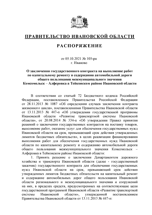 Распоряжение Правительства Ивановской области от 05.10.2021 N 105-рп "О заключении государственного контракта на выполнение работ по капитальному ремонту и содержанию автомобильной дороги общего пользования межмуниципального значения Комсомольск - Алферовка в Тейковском районе Ивановской области"