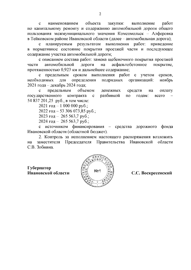 Распоряжение Правительства Ивановской области от 05.10.2021 N 105-рп "О заключении государственного контракта на выполнение работ по капитальному ремонту и содержанию автомобильной дороги общего пользования межмуниципального значения Комсомольск - Алферовка в Тейковском районе Ивановской области"