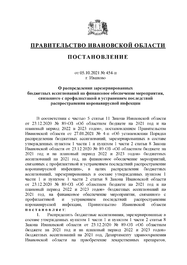 Постановление Правительства Ивановской области от 05.10.2021 N 454-п "О распределении зарезервированных бюджетных ассигнований на финансовое обеспечение мероприятия, связанного с профилактикой и устранением последствий распространения коронавирусной инфекции"