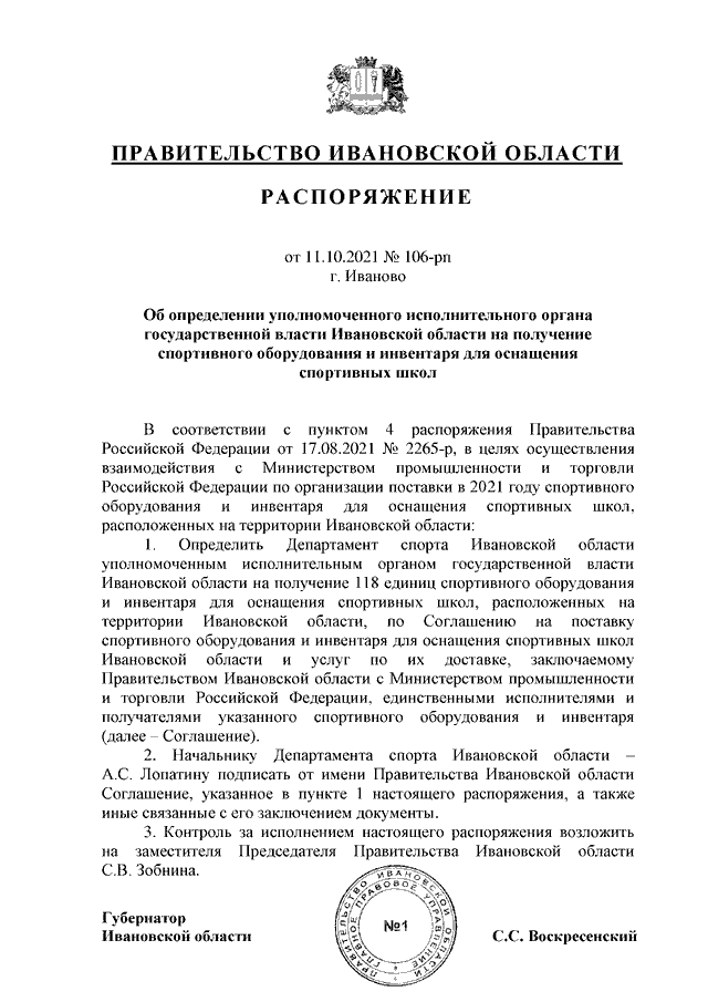 Распоряжение Правительства Ивановской области от 11.10.2021 N 106-рп "Об определении уполномоченного исполнительного органа государственной власти Ивановской области на получение спортивного оборудования и инвентаря для оснащения спортивных школ"