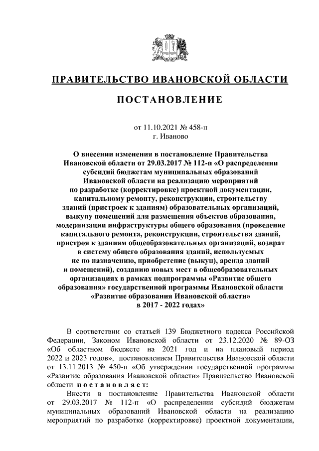 Постановление Правительства Ивановской области от 11.10.2021 N 458-п "О внесении изменения в постановление Правительства Ивановской области от 29.03.2017 N 112-п "О распределении субсидий бюджетам муниципальных образований Ивановской области на реализацию мероприятий по разработке (корректировке) проектной документации, капитальному ремонту, реконструкции, строительству зданий (пристроек к зданиям) образовательных организаций, выкупу помещений для размещения объектов образования, модернизации инфраструктуры общего образования (проведение капитального ремонта, реконструкции, строительства зданий, пристроя к зданиям общеобразовательных организаций, возврат в систему общего образования зданий, используемых не по назначению, приобретение (выкуп), аренда зданий и помещений), созданию новых мест в общеобразовательных организациях в рамках подпрограммы "Развитие общего образования" государственной программы Ивановской области "Развитие образования Ивановской области" в 2017 - 2022 годах"
