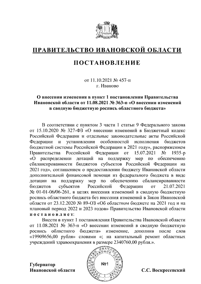 Постановление Правительства Ивановской области от 11.10.2021 N 457-п "О внесении изменения в пункт 1 постановления Правительства Ивановской области от 11.08.2021 N 363-п "О внесении изменений в сводную бюджетную роспись областного бюджета"