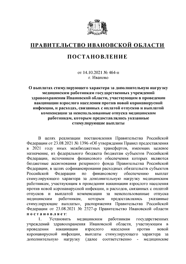 Постановление Правительства Ивановской области от 14.10.2021 N 464-п "О выплатах стимулирующего характера за дополнительную нагрузку медицинским работникам государственных учреждений здравоохранения Ивановской области, участвующим в проведении вакцинации взрослого населения против новой коронавирусной инфекции, и расходах, связанных с оплатой отпусков и выплатой компенсации за неиспользованные отпуска медицинским работникам, которым предоставлялись указанные стимулирующие выплаты"