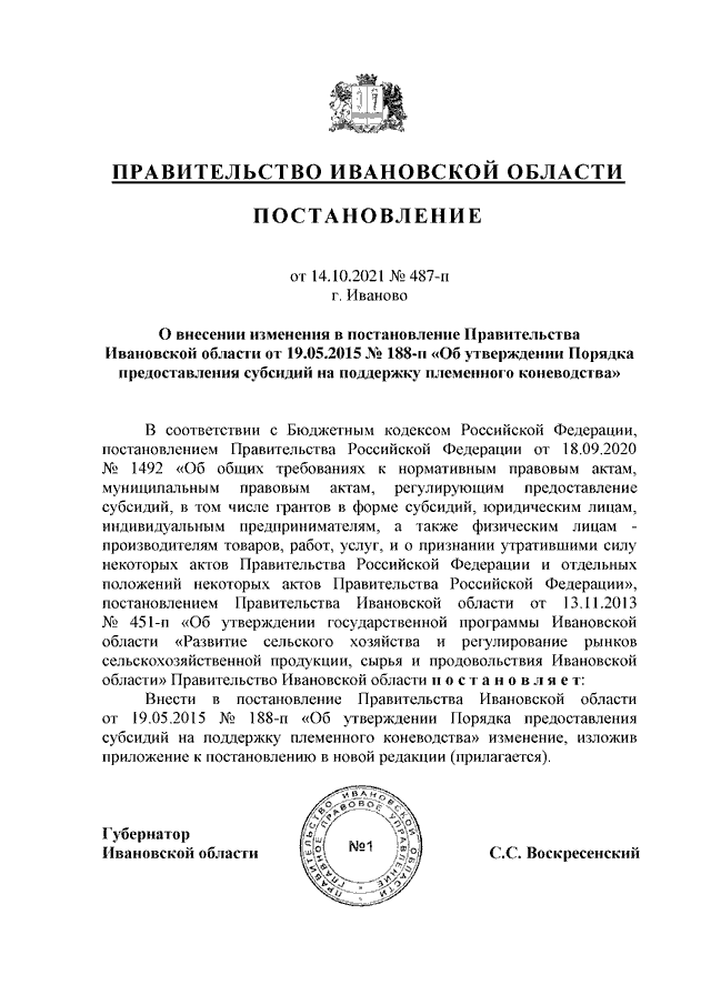 Постановление Правительства Ивановской области от 14.10.2021 N 487-п "О внесении изменения в постановление Правительства Ивановской области от 19.05.2015 N 188-п "Об утверждении Порядка предоставления субсидий на поддержку племенного коневодства"
