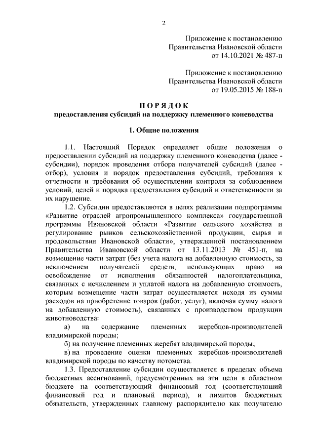 Постановление Правительства Ивановской области от 14.10.2021 N 487-п "О внесении изменения в постановление Правительства Ивановской области от 19.05.2015 N 188-п "Об утверждении Порядка предоставления субсидий на поддержку племенного коневодства"