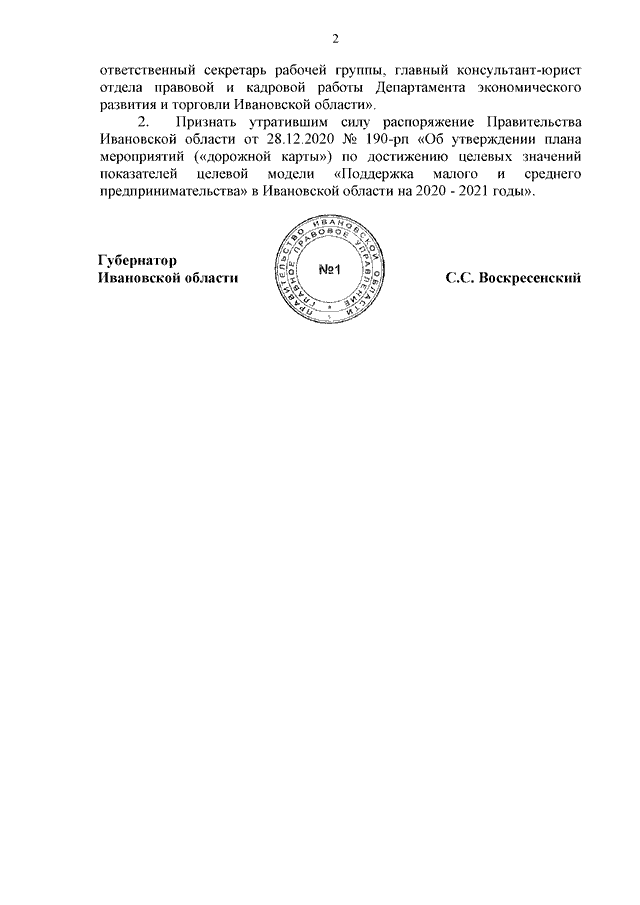 Распоряжение Правительства Ивановской области от 14.10.2021 N 111-рп "О внесении изменения в распоряжение Правительства Ивановской области от 24.04.2014 N 85-рп "О составе рабочей группы по внедрению и развитию оценки регулирующего воздействия проектов нормативных правовых актов Ивановской области и экспертизе нормативных правовых актов Ивановской области, затрагивающих вопросы осуществления предпринимательской и инвестиционной деятельности в Ивановской области" и о признании утратившим силу распоряжения Правительства Ивановской области от 28.12.2020 N 190-рп "Об утверждении плана мероприятий ("дорожной карты") по достижению целевых значений показателей целевой модели "Поддержка малого и среднего предпринимательства" в Ивановской области на 2020 - 2021 годы"