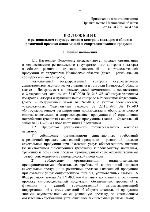 Постановление Правительства Ивановской области от 14.10.2021 N 472-п "Об утверждении Положения о региональном государственном контроле (надзоре) в области розничной продажи алкогольной и спиртосодержащей продукции"