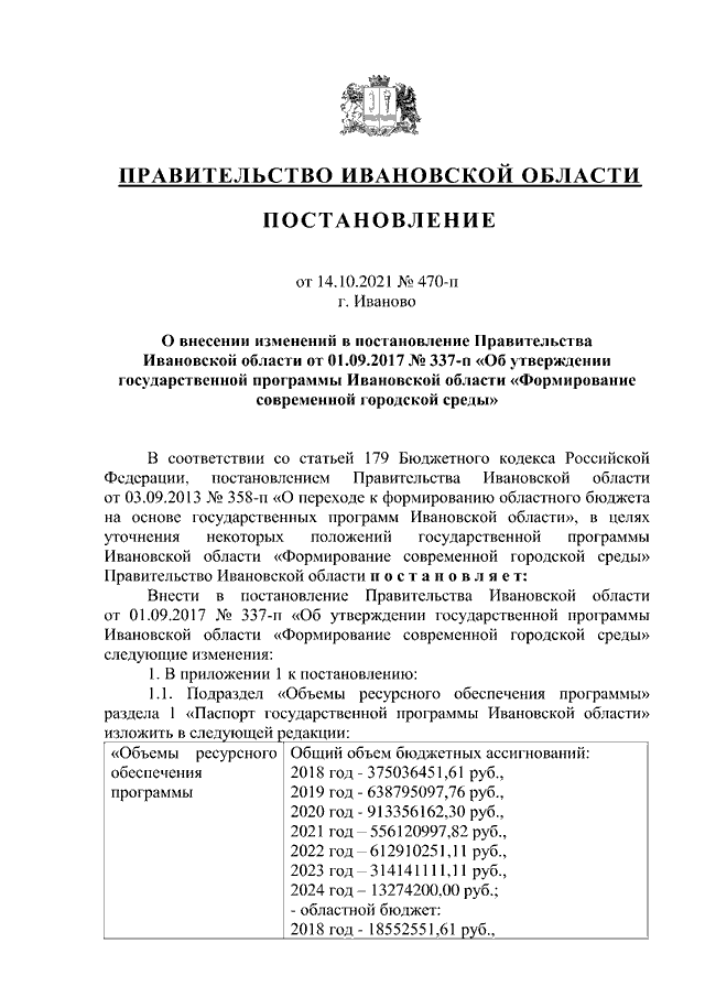 Постановление Правительства Ивановской области от 14.10.2021 N 470-п "О внесении изменений в постановление Правительства Ивановской области от 01.09.2017 N 337-п "Об утверждении государственной программы Ивановской области "Формирование современной городской среды"