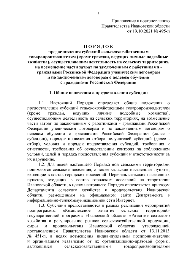 Постановление Правительства Ивановской области от 19.10.2021 N 495-п "Об утверждении Порядка предоставления субсидий сельскохозяйственным товаропроизводителям (кроме граждан, ведущих личные подсобные хозяйства), осуществляющим деятельность на сельских территориях, на возмещение части затрат по заключенным с работниками - гражданами Российской Федерации ученическим договорам и по заключенным договорам о целевом обучении с гражданами Российской Федерации"