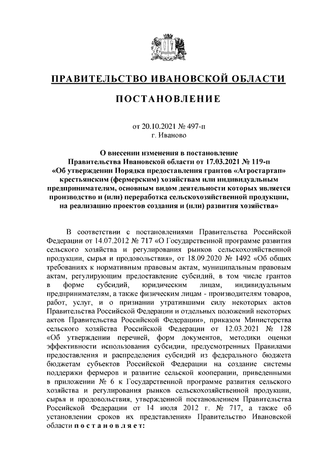 Постановление Правительства Ивановской области от 20.10.2021 N 497-п "О внесении изменения в постановление Правительства Ивановской области от 17.03.2021 N 119-п "Об утверждении Порядка предоставления грантов "Агростартап" крестьянским (фермерским) хозяйствам или индивидуальным предпринимателям, основным видом деятельности которых является производство и (или) переработка сельскохозяйственной продукции, на реализацию проектов создания и (или) развития хозяйства"